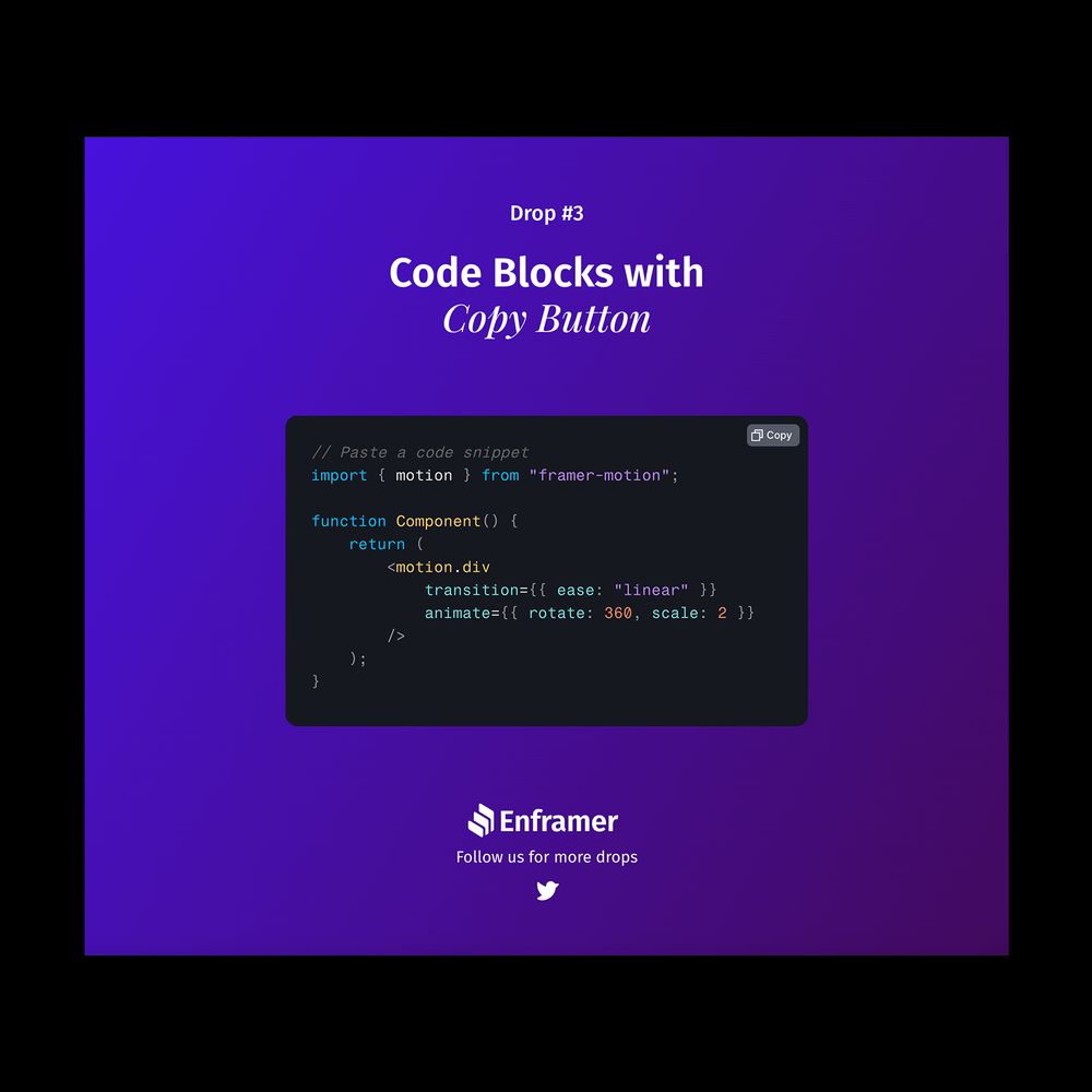 Freebie Alert: Custom Code Block with Copy Button for Framer! By default the code block component provided in the insert panel doesn't have a copy to clipboard button. This component by Enframer.com combined with the original code block component allows you to display a code block with a copy button on your page. Preview Here Get your free remix link now and elevate your Framer projects!