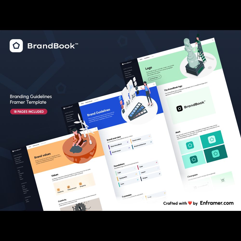 BrandBook™ is the ultimate Framer template for creating comprehensive brand guidelines. Showcase your brand typography, color palettes, logos, icons, and more with pre-designed layouts. Establish a distinctive brand identity that sets you apart with ease. Live Preview ➔ BrandBook.framer.website This framer template includes 18 Pages across 4 categories: Brand Overview (5 Pages) HomeAbout brandBrand valuesBrand missionBrand architecture Foundation (6 Pages) LogoColorTypographyLayoutIconsShapes Expression (5 Pages) WritingEmojiIllustrationPhotographyMotion Experiences (2 Pages) EventsOffices