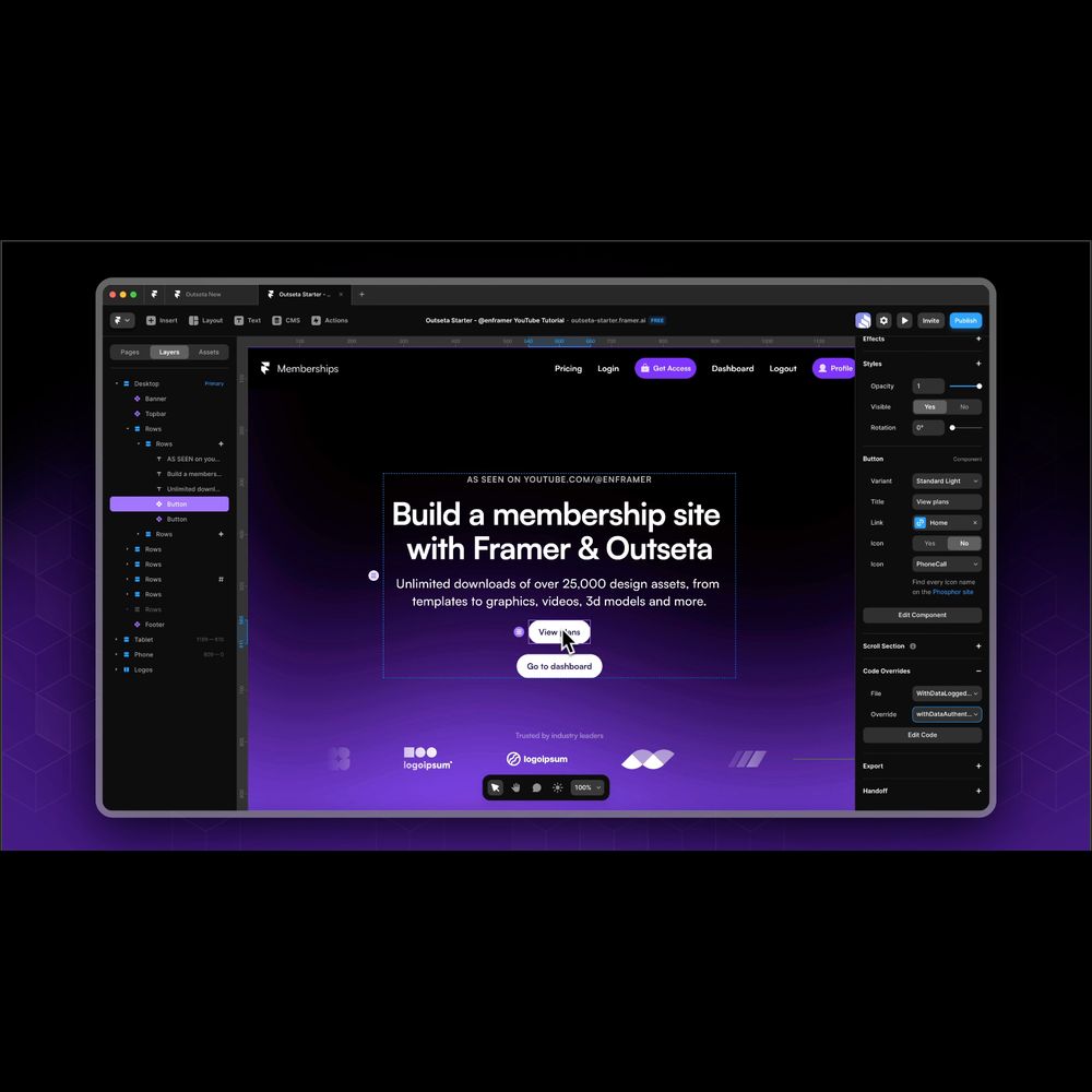 This template allows you to create membership websites in Framer using Outseta. You can create multiple membership plans, give access to content based on the user current access level, show and hide content based on a user membership plan, setup Outseta sign up, login and profile forms and much more. This is part of the "Create a membership site in Framer from scratch" video tutorial series found on YouTube where you learn how to convert this starter template into a fully functioning Membership website. Remix this template and head to our YouTube channel to get started. Live demo: https://outseta-starter.framer.ai